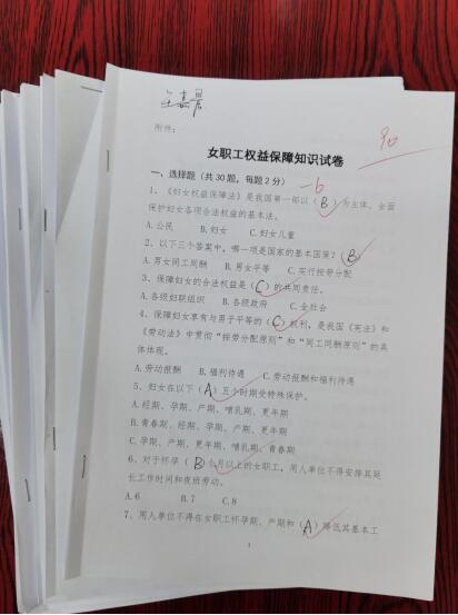 公司各基層單位因地制宜,積極開展《女職工勞動(dòng)保護(hù)特別規(guī)定》《寧夏女職工勞動(dòng)保護(hù)辦法》《寧夏婦女權(quán)益保障條例》等法律法規(guī)知識的學(xué)習(xí),全體女工參與“女職工權(quán)益保障知識試卷”有獎(jiǎng)答題活動(dòng)。