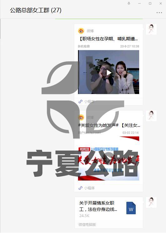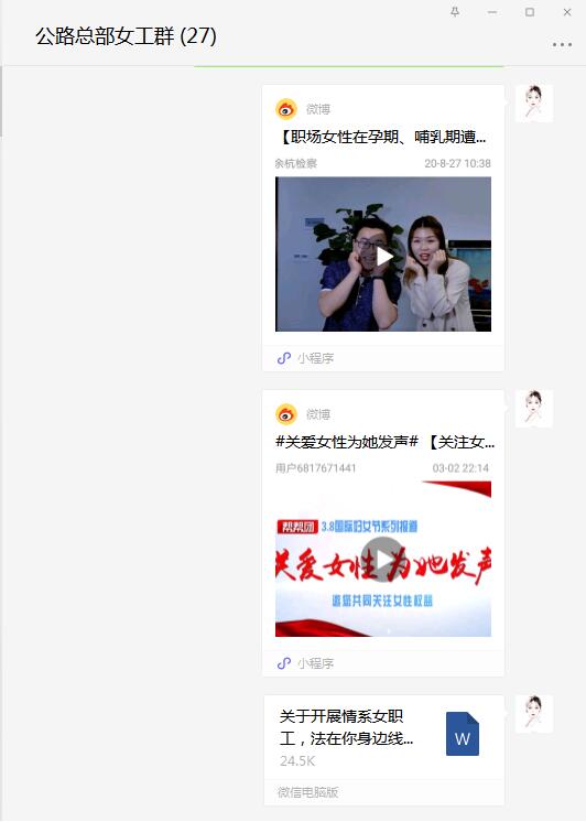 利用女職工微信群組織廣大女工進(jìn)行“職場女性在孕期、哺乳期遭遇不公平待遇,被辭退應(yīng)該如何維權(quán)?”及“關(guān)注女性權(quán)益!”等專題視頻學(xué)習(xí),不斷提高女職工法律意識和依法維權(quán)意識。