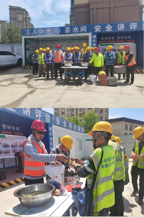 在嚴(yán)格把控安全生產(chǎn)的同時,項目部始終關(guān)懷工友們的生活需求。端午節(jié)當(dāng)天,項目領(lǐng)導(dǎo)班子帶領(lǐng)管理團(tuán)隊為工友們送上粽子、香蕉、蘋果等節(jié)日慰問品。慰問現(xiàn)場,項目負(fù)責(zé)人與工友們親切交流:“在這個本該與家人團(tuán)聚的日子里,你們舍小家、為大家,依然堅守崗位,為高橋家園保障性租賃住房項目建設(shè)揮灑汗水。正是因為有你們的辛勤付出,項目才能穩(wěn)步推進(jìn)。希望大家在作業(yè)的同時,一定要把安全放在首位,注意勞逸結(jié)合、保重身體。”真摯的話語如汩汩清泉,流淌在每位建設(shè)者心間。